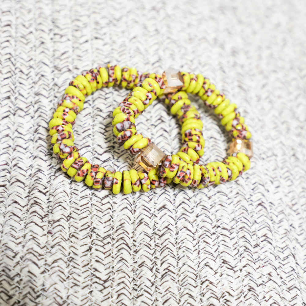 This set includes two stylish bracelets. Both feature green beads with a bright yellow topping, with one accented by sparkling crystals for an added touch of elegance. These bracelets are perfect for adding a pop of color to any outfit, whether worn together or separately.
